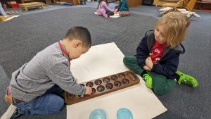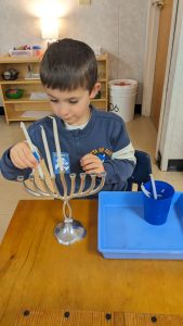 This week we began discussing many holiday cultures and traditions. First, we explored and learned about Hanukkah, an eight day Jewish “festival of lights” celebration. Students discovered the joy of playing the dreidel game with gelt, transferred candles into a Menorah, painted the Star of David, read books about Hanukkah, and made a booklet of vocabulary words. The EC community also had the opportunity to participate in a special Hanukkah presentation from one of our MSBG families who taught us about their own family traditions when celebrating this Holiday! Kwanzaa was another Holiday observed in December that we discussed. Students learned about the Seven Principles of Kwanzaa. Making a kinara was an art activity this week as well as trying the process of weaving a mat. Kwanzaa colors were represented throughout many works and the game Mancala was introduced as many families incorporate this into their celebrations to remember the heritage and ancestry. Our next food preparation work this week was frosting and decorating a cookie! One of their favorites! We also ended the week with a beautiful extension of our sensorial materials called the “sensorial Christmas tree.” Students work together using our red rods and knobless cylinders to make and decorate a tree.