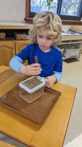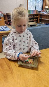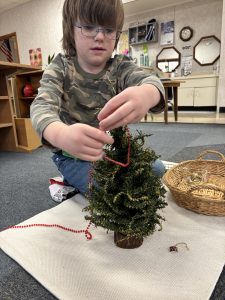 What a fun and festive week we had! The week began with a wonderful band performance by our Upper and Middle school students. Our class enjoyed the sing along songs and all the instruments! We had a lesson about gift wrapping and gift giving. Friends had the opportunity to wrap a present and deliver it to another friend using their imagination on what gift was received! We studied the holiday of Christmas this week. Students learned about decorating a Christmas tree and setting up the Nativity Scene where they could retell the story of the birth of baby Jesus. They used their stringing skills to string beads onto pipe cleaners and make a beaded candy cane decoration! Our class also grated cinnamon sticks. Two peppermint science experiments were demonstrated this week! Ask your child what happened to the candy cane when placed in a glass of water! They also observed what happened to circle peppermints in a tray when hot water was poured over them. On Friday we celebrated the season with our Winter party! We enjoyed wearing our pajamas, listening to a special winter pop-up book, played games, sang songs, and enjoyed special treats and a short movie with popcorn. Have a wonderful holiday break and see you all in the New Year!