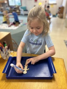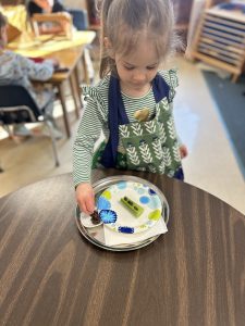 Happy Montessori Education Week! We loved celebrating Montessori with all of our students and families this week. We dressed as students, celebrated our teachers, beautified our school, donated cat and dog food to a local food bank, supported our communities, and enjoyed a special PJ Day! We created peace people in art and added them to our peace corner to represent each individual in our class community! Also, we added water transfer works to our practical life shelves and enjoyed another food prep lesson, Ants on a Log. For this lesson, students tong celery, spread cream cheese and used their pincers to add raisins. In sensorial, we introduced bell matching, an excellent way for students to train the ear to recognize matching notes throughout the C scale. A new sensorial unit was also introduced, Thermic, allowing students to develop temperature discrimination by matching/ordering pairs of tables made from materials with distinct heat-conducting properties.