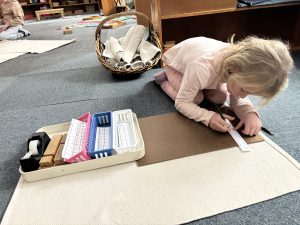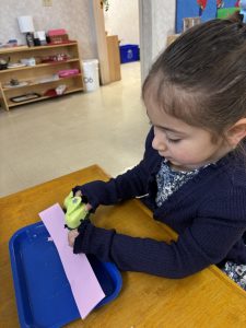Happy February! Did you hear that Groundhog Phil predicted six more weeks of winter weather? The winter weather goes right along with our new science unit this week on animal tracks. Many deer tracks have been spotted in the snow! Students learned about a variety of animals and what their tracks look like. They enjoyed stamping prints onto paper. The thick line cards were added to our Geometric cabinet for another matching activity with our two-dimensional shapes. Art lessons this week included painting a heart at the Easel and using paper punches to punch shapes into paper. A sensory art lesson included using a bag of water to dip in paint and make rose prints! In Practical Life we introduced locks and keys for a fun fine motor life skill! They had to match keys to open different kinds of locks! Our light table was added to the classroom for a beautiful sensorial exploration. Our food preparation was slicing bananas! The kindergartners also had a math lesson on the 1,000 roll. This number work focuses on writing the numerals 1-1,000 on paper color coded by place value.