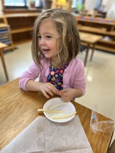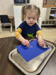Welcome back! We hope you all enjoyed a peaceful winter break. We began our week reviewing our classroom procedures, including how to carefully use our classroom rugs and walk safely in our environment. The students seemed very happy to be back in the classroom! Our first new work of January was drawing snowy scenes with chalk. We also added Cutting a Snowflake to our art shelf. This week also brought us new Science and Sensorial units. The students began to study Simple Machines and the science behind different types of movement and mechanics. Our new sensorial unit, Baric, was introduced and allows the study of weight differences. The small hexagon box and the rectangle box were also added to our sensorial shelves, both of which continue to reinforce geometric shapes and how they combine to form different shapes. String Cheese, our next food preparation lesson, was introduced to practical life. Students practiced using their pincer fingers to pull apart the wrapper, pull off pieces of cheese and eat their prepared snack!