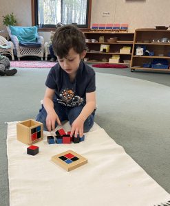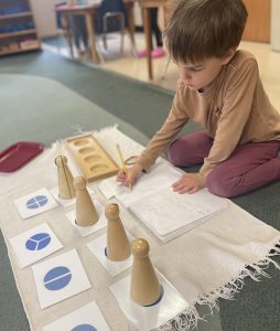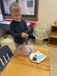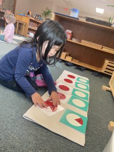 This week we began our new special Math Unit, Fractions! Students explore different parts of a whole to understand this new concept. The Montessori Fraction Skittles allow the child to feel 1, ½, ⅓, and ¼ and compare the parts. In sensorial, we added the binomial cube, giving students the opportunity to explore the foundations of algebraic squaring and Color Box 2. Our first food preparation lesson was shared with the students – Grape Plucking. This work is part of our Practical Life curriculum and allows the student to understand the process of independently preparing and enjoying a snack. Thank you to all the families that donated to our grape lesson! Slicing velcro fruit and veggies were also added to the Practical Life shelf, a fun work that teaches the new skill of slicing. New units were added to the Science and Geography shelves. Living and Non-living were introduced to Science, and My Family was added to the Geography shelf. Both the science and geography units encourage exploration and a greater understanding of their environment around them and the students’ place in their unique family. Finally, we added the orange stepper to our movement shelf this week, giving children the opportunity to choose another way to get movement in while using our yoga mat in the classroom.