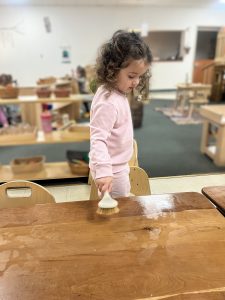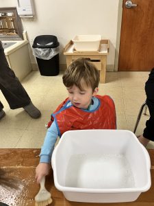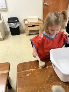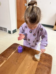 Our toddlers practiced scrubbing tables in the classroom this week. This activity helps children strengthen their fine motor skills while learning how to properly hold and use a tool. The toddlers were highly engaged as they worked, developing a sense of responsibility and care for their environment. They also enjoyed exploring the sensory experience of the water and brushes during this hands-on activity.