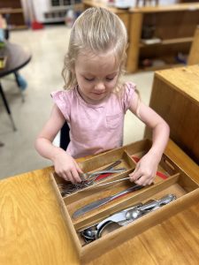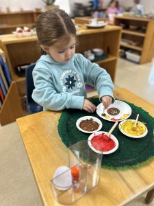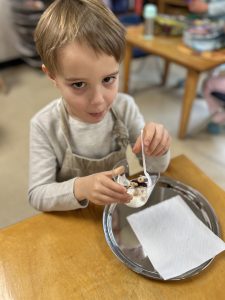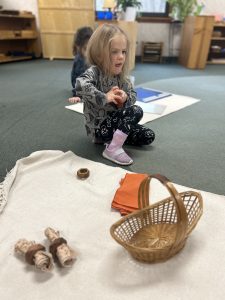 We continued fall-themed practical life lessons this week, including feathers in a turkey and creating a cornucopia! We will use these items next week for our feast. We also introduced place setting, silverware sorting, and napkin rolling. In practical life food prep, we made yogurt parfaits! Children had the opportunity to create their own special treat, spooning yogurt and Cheerios and tonging cranberries. On the art shelf, students could create turkey art using fingerpaint and also a tissue paper cornucopia. Thank you to everyone who was able to bring in apples for us to make applesauce for next week!