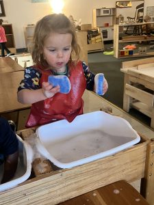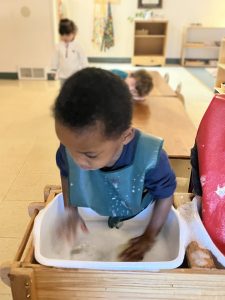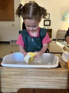 This week, our toddlers explored sponge-squeezing work! This activity supports the development of fine motor skills, hand-eye coordination, and concentration. By squeezing the sponge, the children strengthen the small muscles in their hands and fingers while practicing controlled, purposeful movements. As they completed the task independently, they also built confidence, independence, and the ability to sustain their attention.