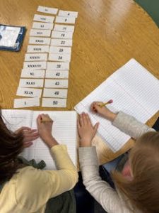 In History, we are studying Roman Numerals. This unit stems from the Fifth Great Lesson, How Numbers Began.  Students will match and learn to write the Roman Numerals into the millions. This unit has always been a favorite of the students.